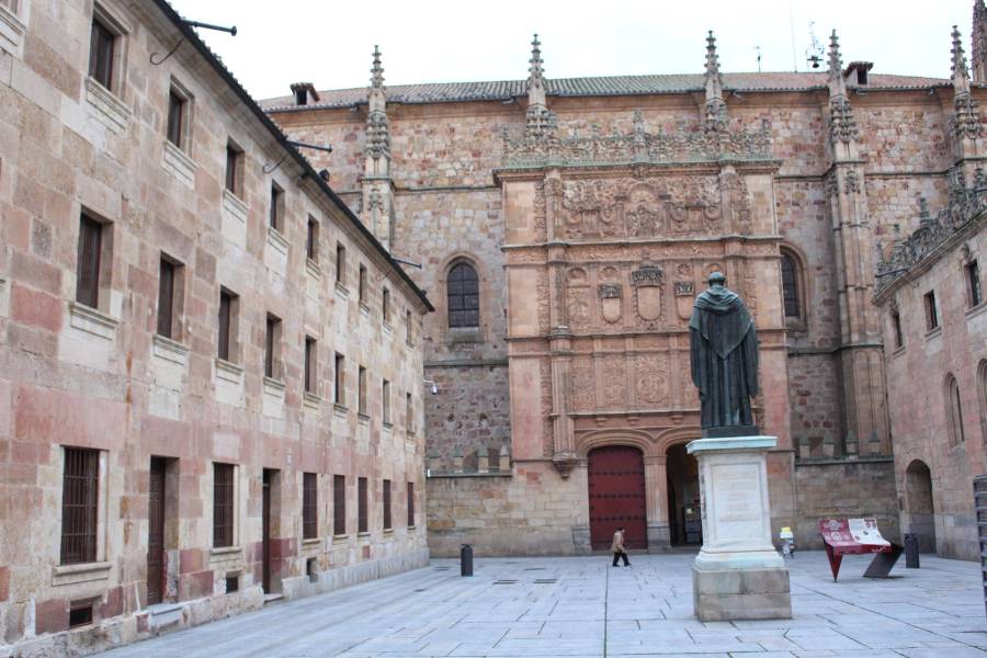 De frente, se encuentra el Patio de las Escuelas de Salamanca, en cuyo centro se erige una señorial estatua de Fray Luis de León, uno de los más destacados profesores que tuvo la Universidad salmantina. Obra de Nicasio Sevilla, erigida en 1869 por suscripción popular.