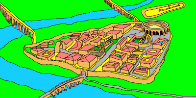 Anfiteatro romano. Erigido en el 8 a.C. como atestiguan las inscripciones halladas en sus tribunas, sirvió de escenario para espectáculos muy populares: los juegos de gladiadores, las cacerías de fieras y la lucha entre animales salvajes en escenarios artificiales que recreaban bosques., selvas con lagunas o desiertos, todo ello sobre las grandes tarimas de madera que formaban la arena. La cabida aproximada de este coso gigantesco era entre quince y dieciséis mil espectadores.