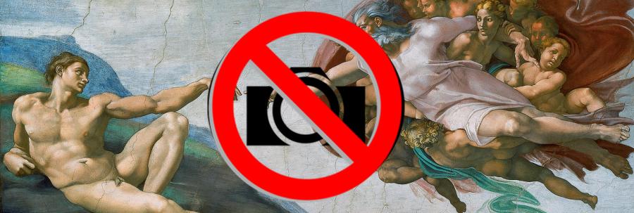 El caso es que distinguir entre aficionados y profesionales de la fotografía y de los medios audiovisuales se antojaba ciertamente dificultoso, de modo que se optó por una prohibición total, quedando restringido a los documentos oficiales que se ponen a la venta. La visita a la Capilla resulta un tanto siniestra. Contribuye a esta sensación el casi de continuo grito de ¡no fotos! retumbando en la sala enmudecida por la grandiosidad de la obra y por verse asediado por miradas siniestras de vigilantes con poderes inquisitorios.