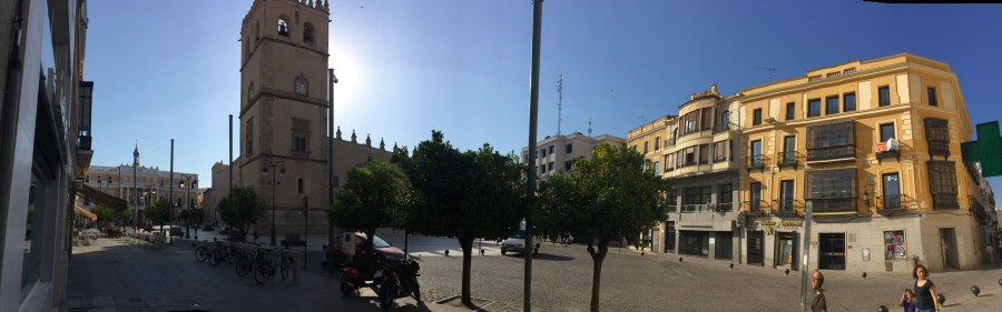 Desde esta posición, la perspectiva de la Plaza de España es majestuosa, sobresaliendo en su frente la Catedral y, al fondo, el Ayuntamiento de Badajoz. El tránsito de vehículos aparece reducido y la explanada se presenta sin bordillos con unos ramales de naranjos que dan colorido al recorrido y con unas luminarias singulares que embellecen el entorno. Nada mejor que tomarse un tiempo en divisar todo lo que aparece en este espacio.