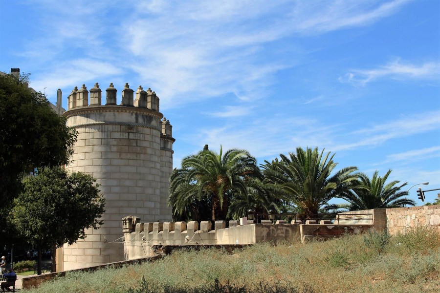 En este tránsito se llega a uno de los monumentos más representativos de la ciudad de Badajoz, la Puerta de Palmas, una de las puertas de la muralla que rodeaba la ciudad que fue finalizada en el año 1551, como reza en la inscripción que tiene en su fachada exterior, siendo príncipe Felipe II y emperador Carlos V. En sucesivas etapas, el entorno de la Puerta de Palmas sufrió numerosas remodelaciones en su ordenación y elementos adyacentes (la última en 1960), aunque manteniéndose siempre como punto de acceso fortificado a la ciudad, y más tarde de control a efectos aduaneros y fiscales. Por fortuna, en este día se permite la visita a la zona interior y subir a sus torres.