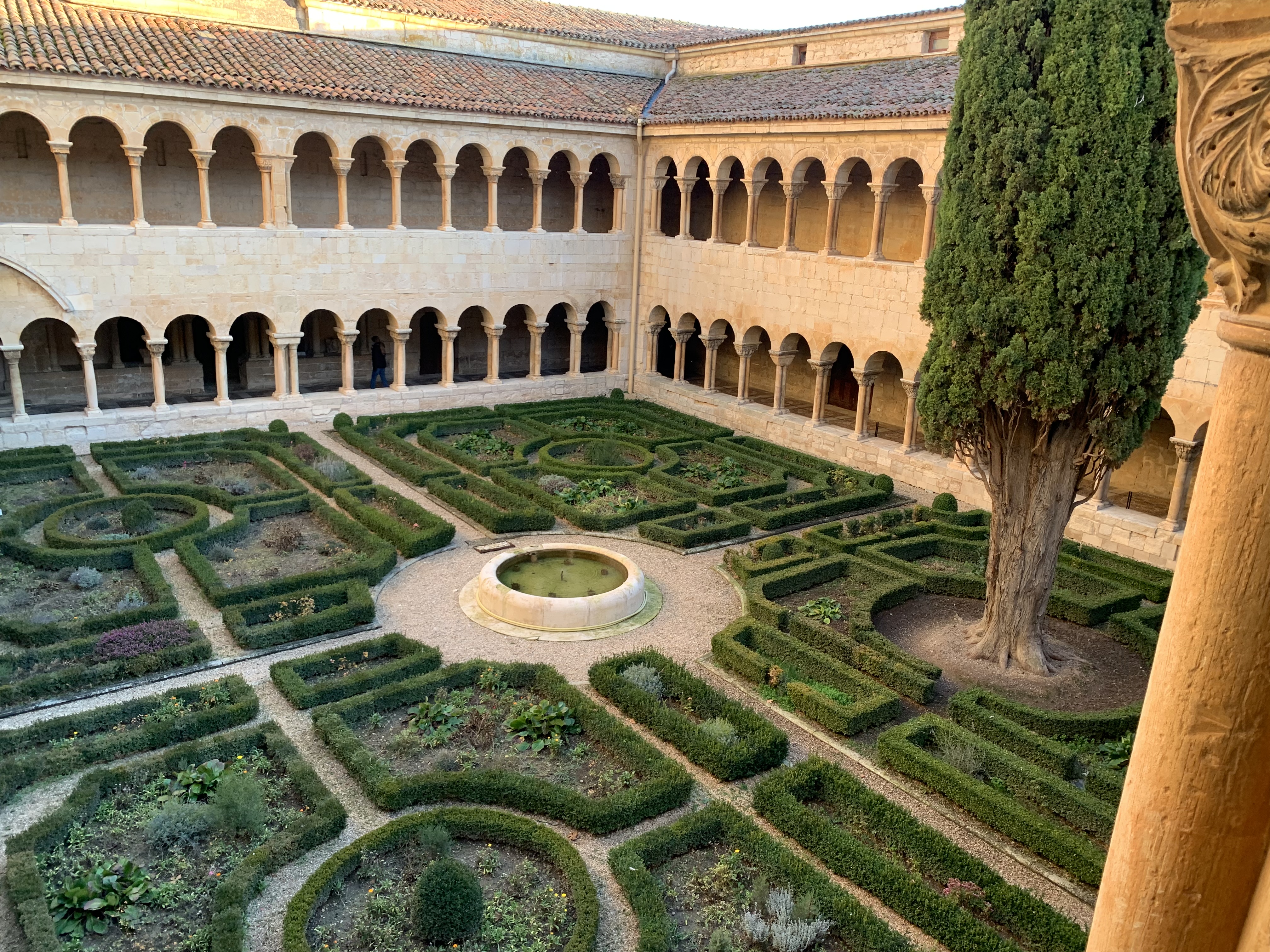 Qué podríamos decir de ese enorme ciprés que se sitúa en el interior del patio. Tan popular como para que muchos lleguen a este lugar deseosos de ver su tamaño. Fue plantado por los monjes franceses restauradores del cenobio en 1882, cuando ajardinaron el claustro. Ya podemos advertir su edad (139 años) y supervivencia por cuanto según se me dice fueron cuatro los ejemplares que se plantaron, uno en cada esquina, y solamente este ha sobrevivido, situado en la zona con más luz.