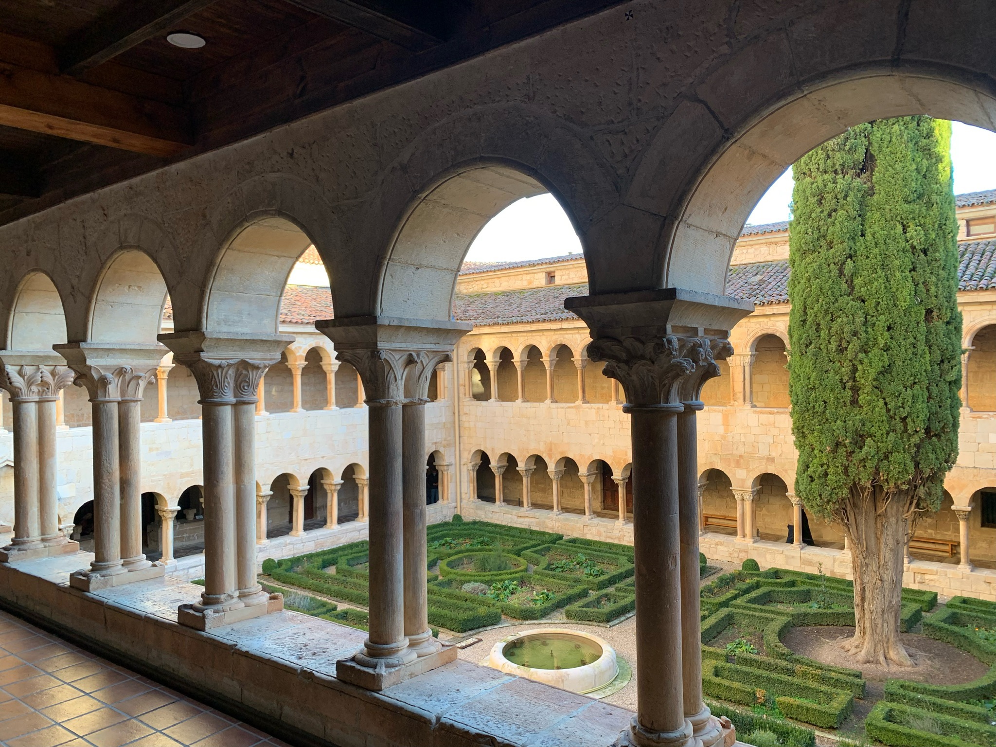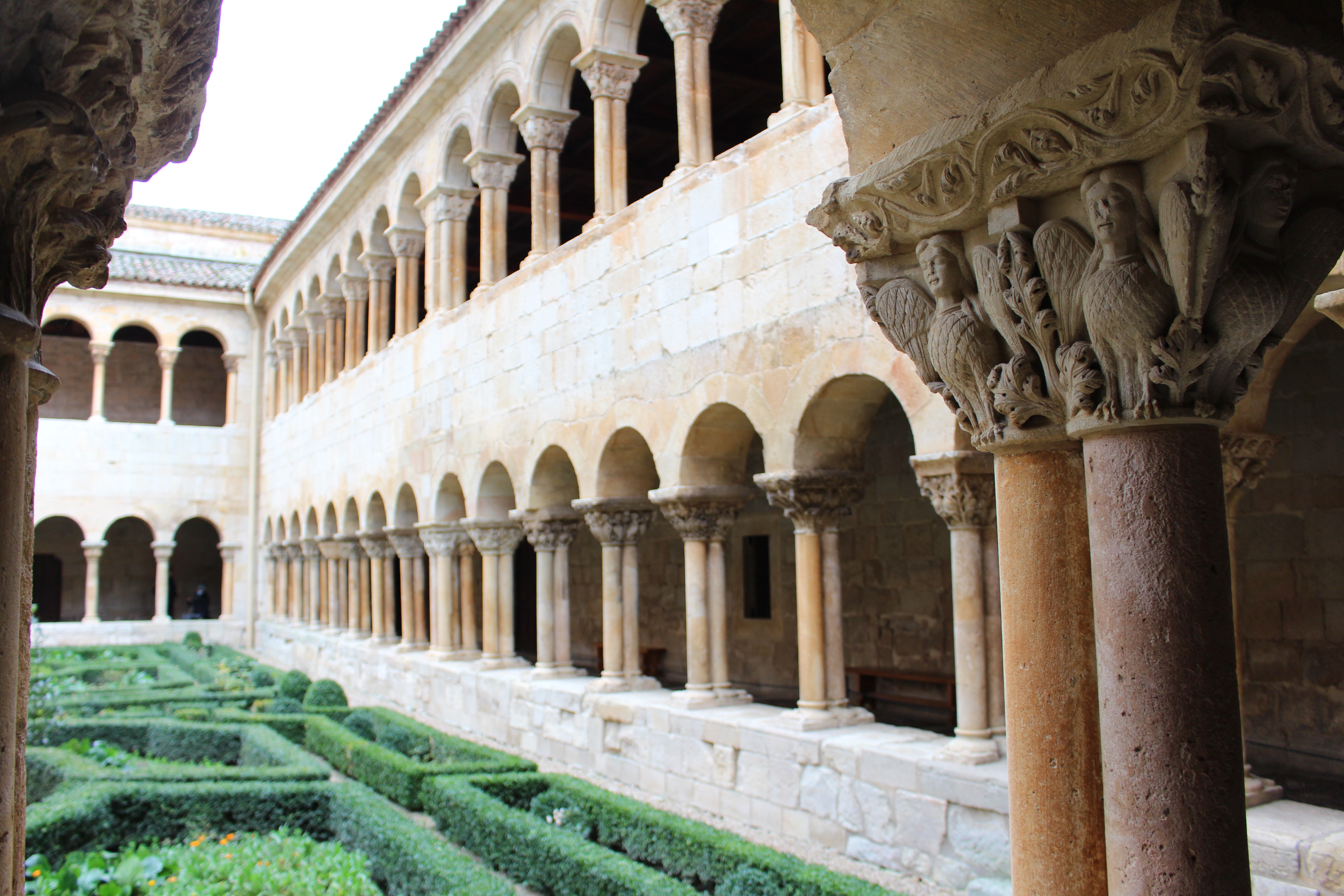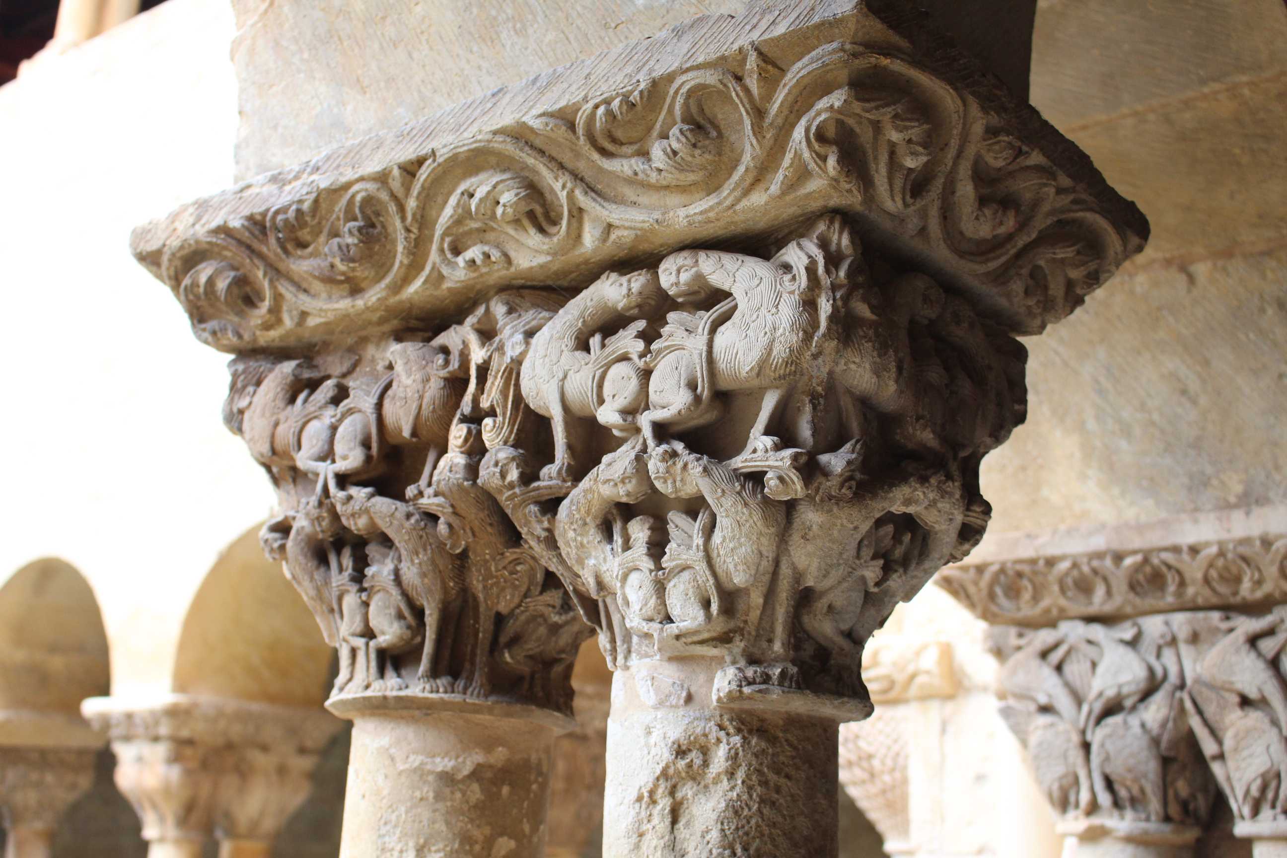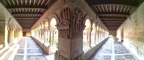 El centro nuclear del Monasterio lo es el claustro románico, cuya simetría me ha entusiasmado y al que he dedicado buenos ratos de paseo y regocijo para mi mente. Una belleza especial. Consta de planta cuadrada irregular de esbeltas arquerías sobre columnas pareadas; y dos niveles que corresponden a épocas distintas: el inferior data del siglo XI y el superior del siglo XII. Puede resaltarse la calidad en arte y simbolismo de los 64 capiteles del nivel bajo, con una colección delirante de encestados, zarcillos, acantos, sirenas, arpías, grifos, leones, centauros, dragones y aves fabulosas. Una de las mayores originalidades lo constituyen los ocho grandes relieves o estaciones que adornan las esquinas.