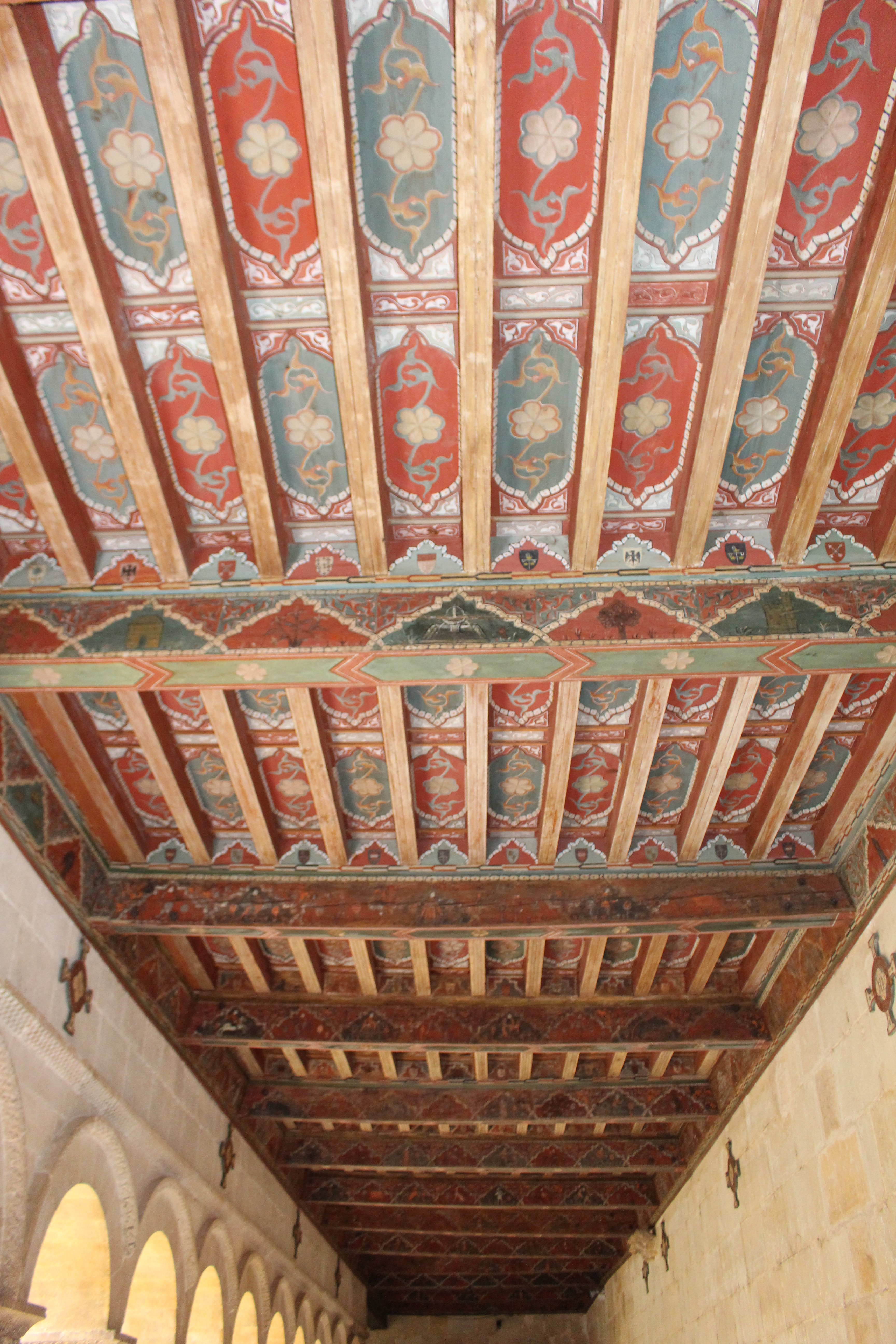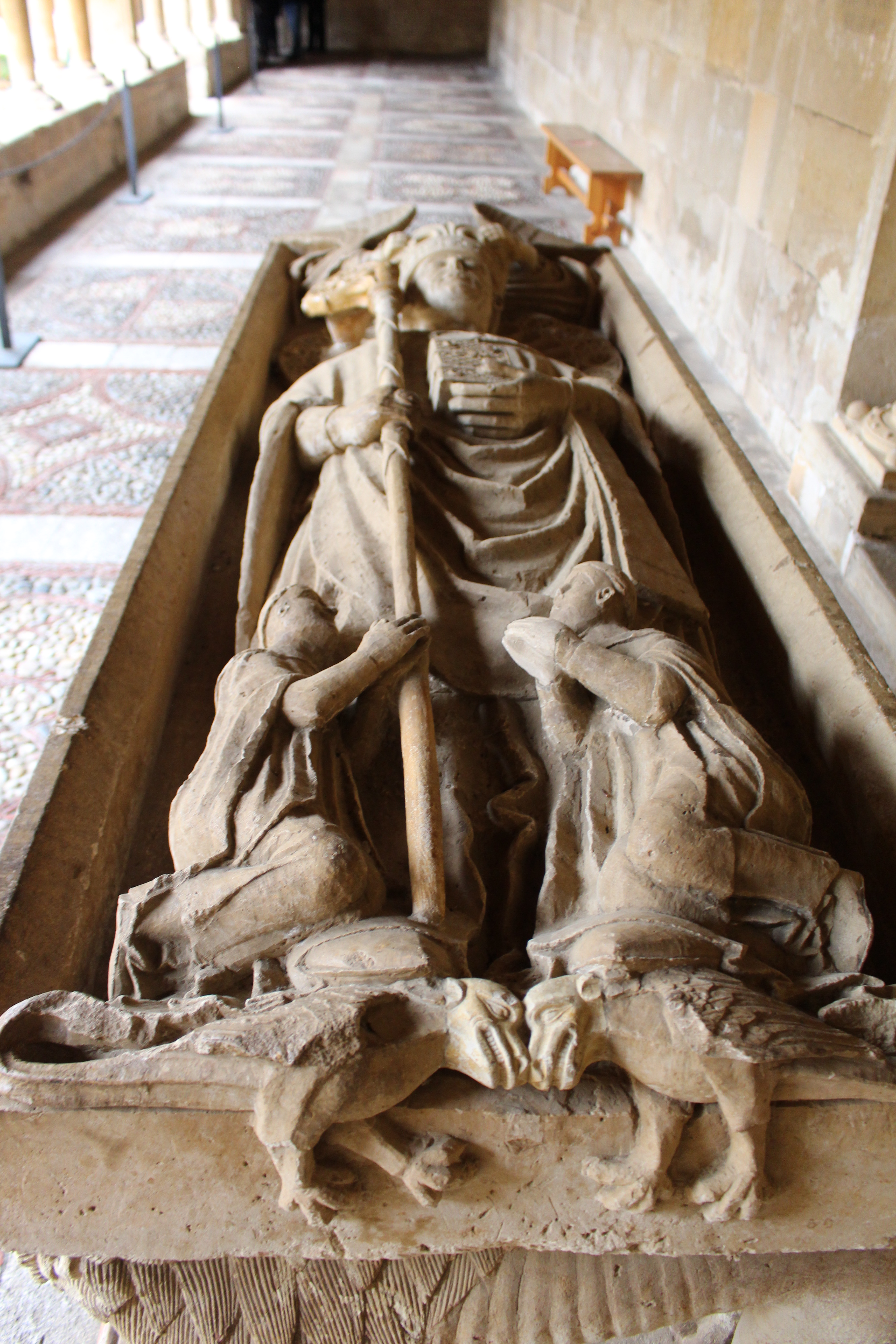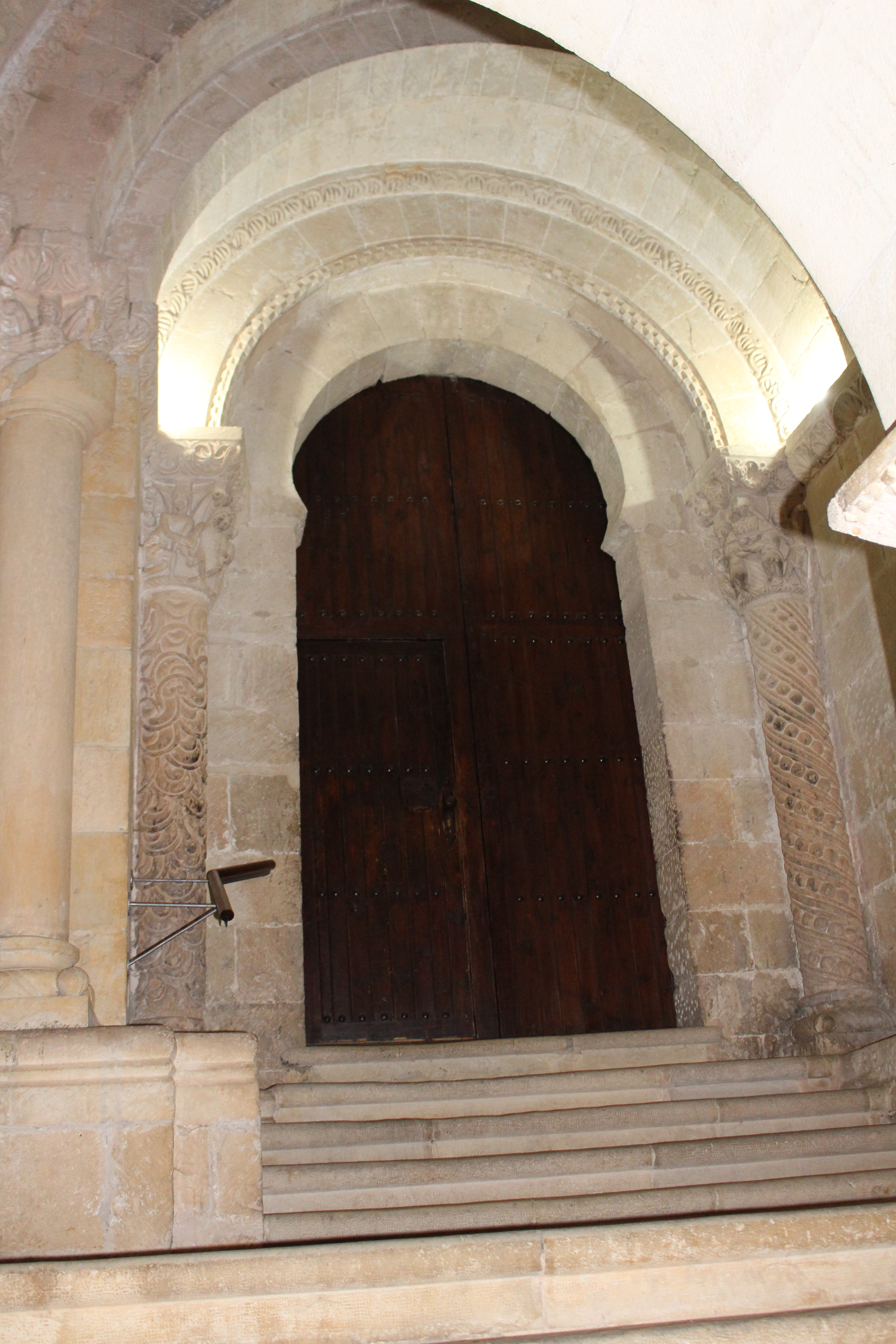El centro nuclear del Monasterio lo es el claustro románico, cuya simetría me ha entusiasmado y al que he dedicado buenos ratos de paseo y regocijo para mi mente. Una belleza especial. Consta de planta cuadrada irregular de esbeltas arquerías sobre columnas pareadas; y dos niveles que corresponden a épocas distintas: el inferior data del siglo XI y el superior del siglo XII. Puede resaltarse la calidad en arte y simbolismo de los 64 capiteles del nivel bajo, con una colección delirante de encestados, zarcillos, acantos, sirenas, arpías, grifos, leones, centauros, dragones y aves fabulosas. Una de las mayores originalidades lo constituyen los ocho grandes relieves o estaciones que adornan las esquinas.