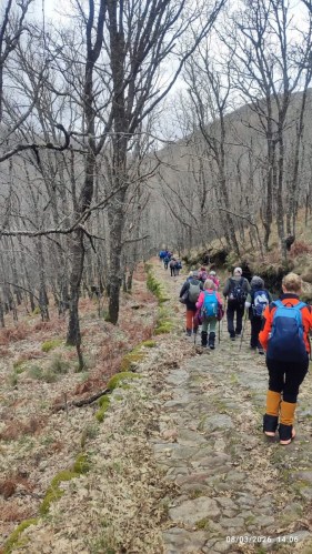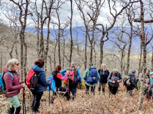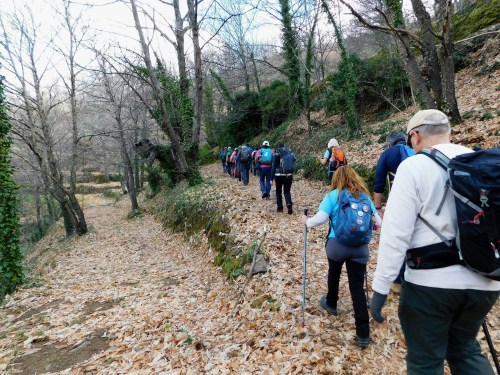 Desde aquí toma las riendas Valentín como guía acostumbrado a estas lides, que se ve acompañado de Alejandra. A sus indicaciones nos sometemos unos cincuenta caminantes, prestos a inmiscuirnos en la hazaña senderista, en un día que se presagiaba con clima lluvioso pero que el de Arriba ha querido que no ocurriera y la temperatura fuera moderada, ideal por tanto para este recorrido. Y menos mal que así ha sido porque de resultar como se preveía hubiera dificultado mucho el trochar por los lugares donde se ha hecho, no fáciles de abordarlos con lluvia.
